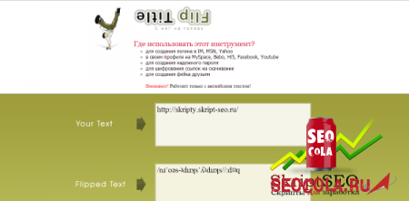 Flip Title можно использовать : * для создания логина в IM, MSN, Yahoo * в своем профиле на MySpace, Bebo, Hi5, Facebook, Youtube * для создания надежного пароля * для шифрования ссылок на скачивание * для создания фейка друзьям